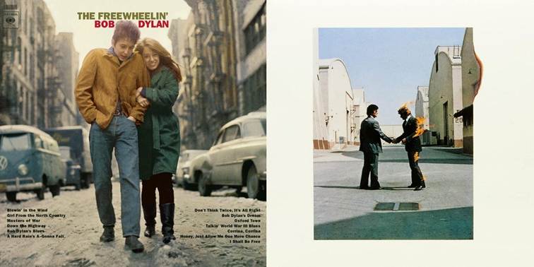Parmi les autres sources d’inspiration, citons la pochette de l’album The Freewheelin’ Bob Dylan [dont nous avons parlé ici], sorti 30 ans plus tôt, et Wish You Were Here de Pink Floyd, qui présente également deux hommes mystérieux sur la pochette.