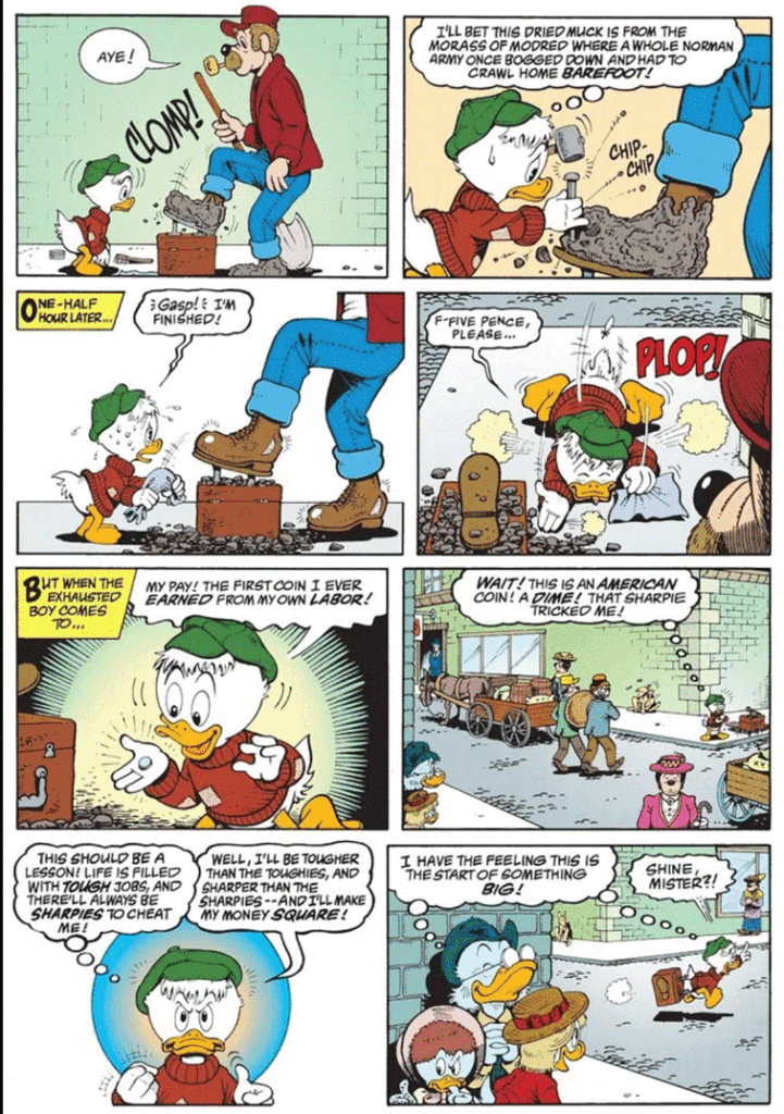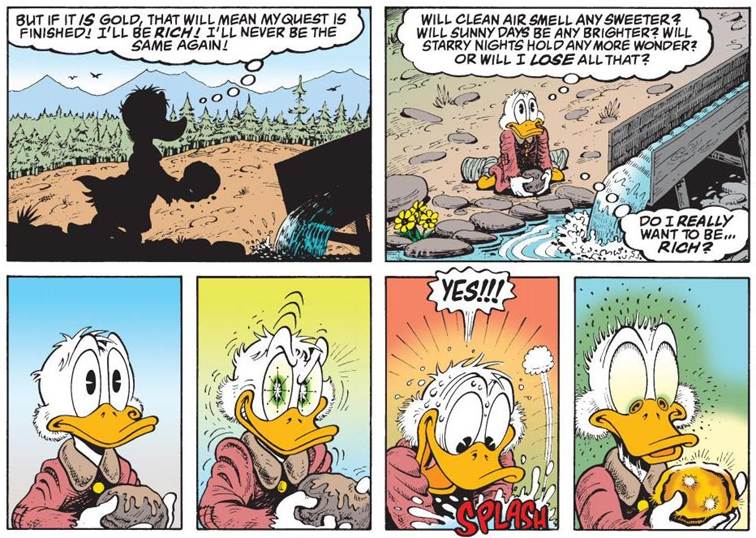 C’est une histoire profonde et mélancolique sur le passage à l’âge adulte qui montre la transformation de McDuck, passant d’un jeune caneton plein d’espoir à un vieux canard cynique, aigri par la vie et obsédé par l’argent. Elle a valu à Rosa le prestigieux Eisner Award en 1995, l’équivalent des Oscars dans le domaine de la BD.