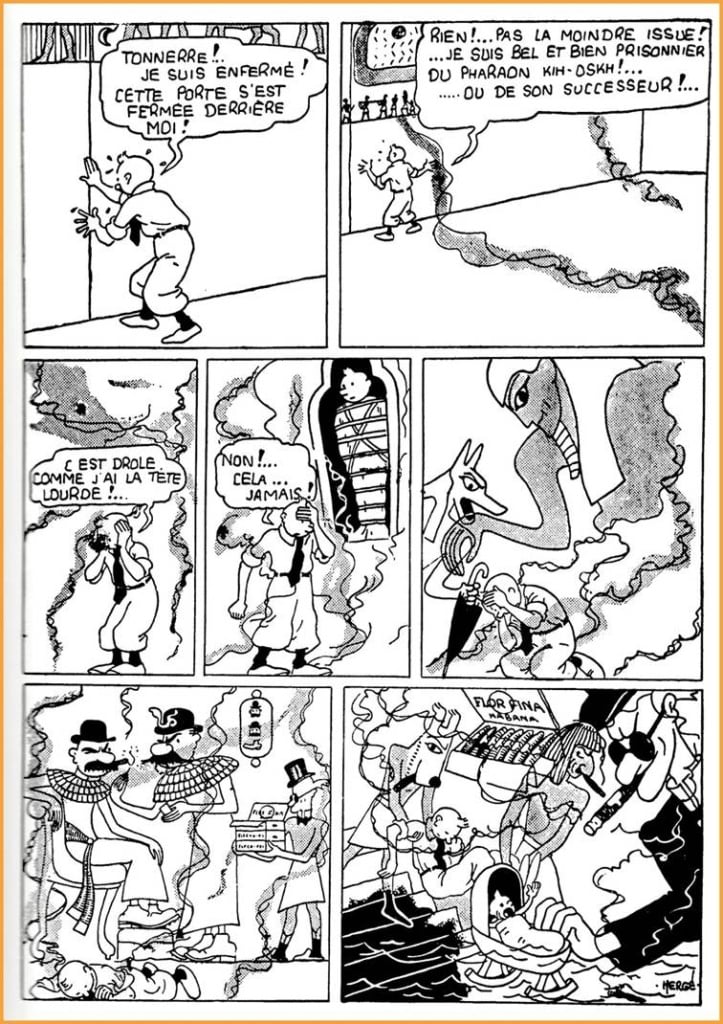 Ce livre a littéralement changé la façon dont Hergé travaillait : auparavant, il n’hésitait pas à apporter des modifications de dernière minute avant d’envoyer ses planches à l’imprimerie, mais cette fois-ci, il a adopté une approche beaucoup plus réfléchie et sérieuse. Avant de construire chaque histoire, il s’entretenait avec des experts, regardait des photographies, visitait des musées et lisait des ouvrages spécialisés. Et il devint méticuleux dans son travail à la plume, qui était aussi techniquement accompli qu’il ne l’avait jamais été.