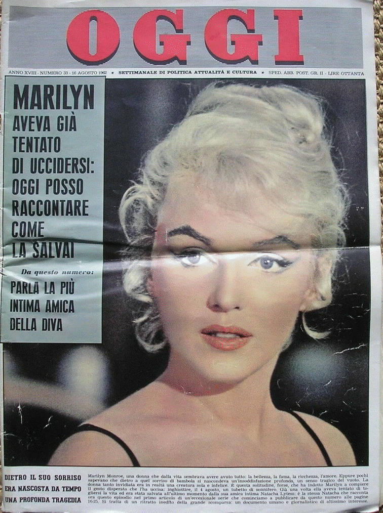 L’une des premières couvertures en couleur était consacrée à la mort de Marilyn Monroe en août 1962. À l’époque, OGGI misait tout sur les scoops, envoyant ses reporters aux quatre coins du monde pour tenter de devancer ses concurrents et obtenir les informations les plus sensationnelles. Cette attitude transparaissait également dans les couvertures, conçues pour se démarquer dans les kiosques grâce à des titres accrocheurs et des gros plans captivants de visages de célébrités.